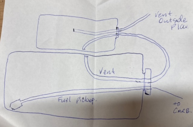 I don’t remember who I got this from, but this is the plan I used. Lots of other pilots do the same. Anything that siphons out of the main tank will catch in the vent tank. Then it will get sucked back into the main tank when I fly upright.